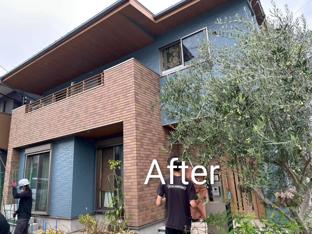 元々は焦茶色の木目サイディングでしたが、ブルーにグレーを入れた様なお色に仕上げたことでお家が明るくなり、可愛らしくなりました✨