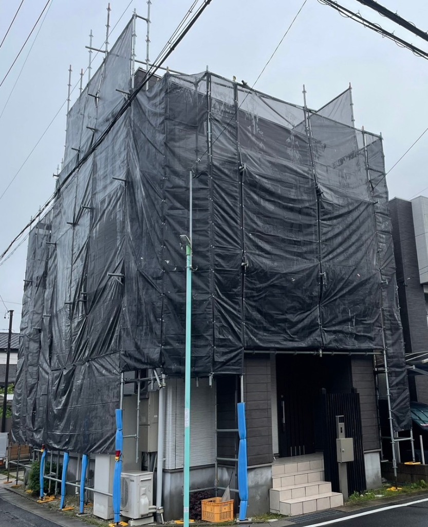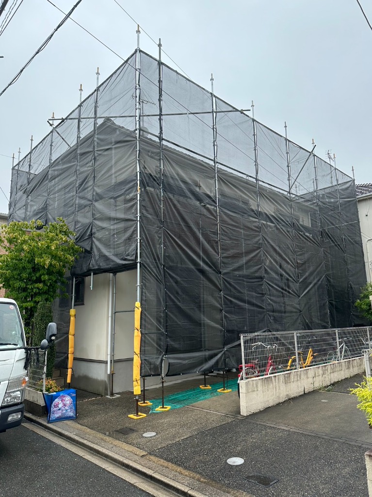 本日は、あいにくの雨天でしたが足場設置2軒を行いました。明日は晴れそうなので高圧洗浄とコーキング作業を行います😊