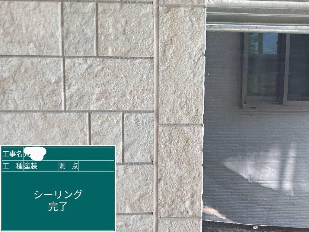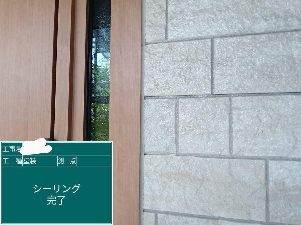 本日は現在施工させて頂いておりますF町のお客様宅の施工写真です。玄関周りのタイル調サイディングの柄は残したいというご希望でしたので、クリア塗装後にベージュのコーキングを打たせて頂きました。お色もマッチしてとても良い感じになりました😊