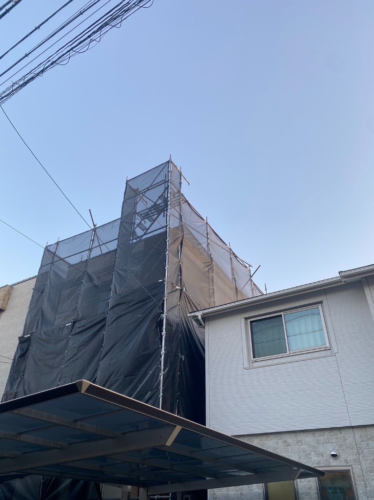 本日は、明日から施工させて頂くお客様のお家の足場設置を行いました。