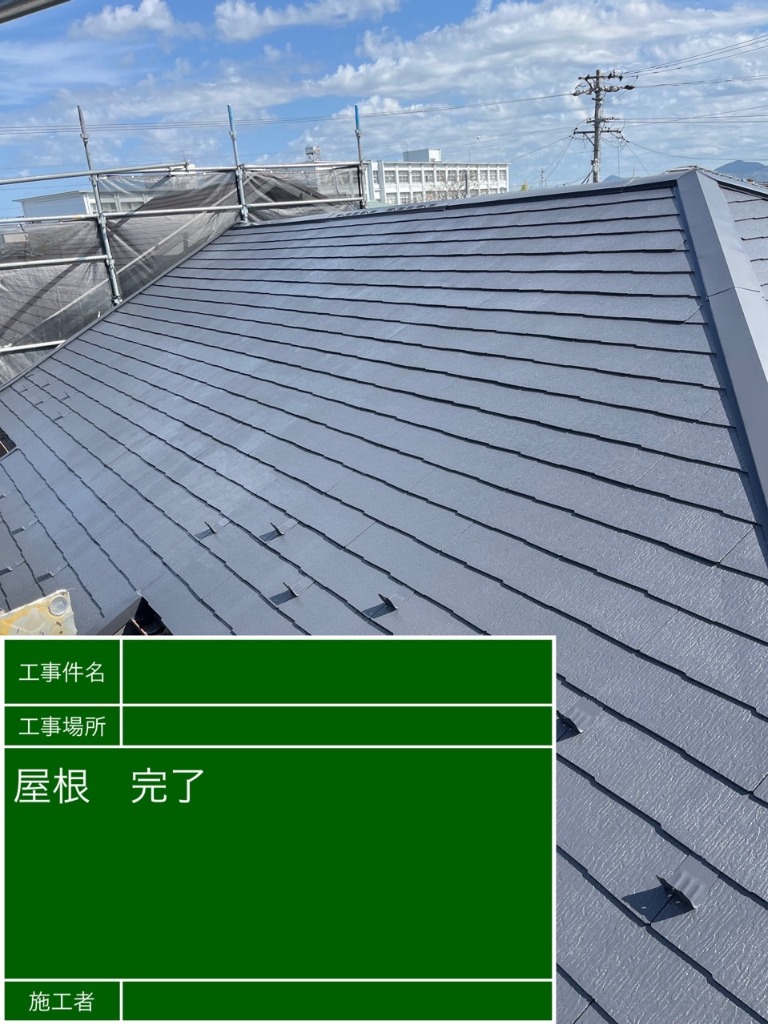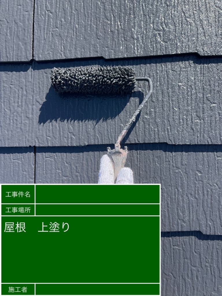 本日は昨日下塗りを入れた屋根の中塗り、上塗り施工が完工いたしました。