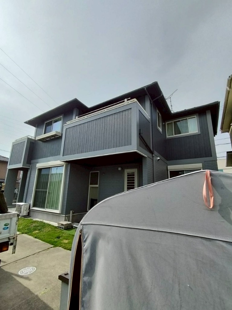 お色はかなり悩まれておりましたが、黒色が気になるとのことでした。全て黒にしてしまうと暗くなってしまうので、2階を黒、1階と幕板にグレーをもっていき落ち着いた雰囲気となりました。