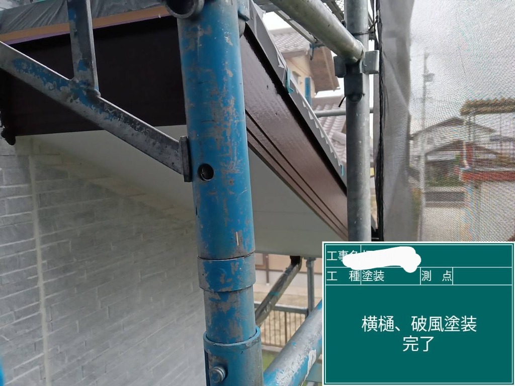 軒樋、軒天、破風、外壁の下塗り、中塗り、上塗りを本日完了いたしました😄