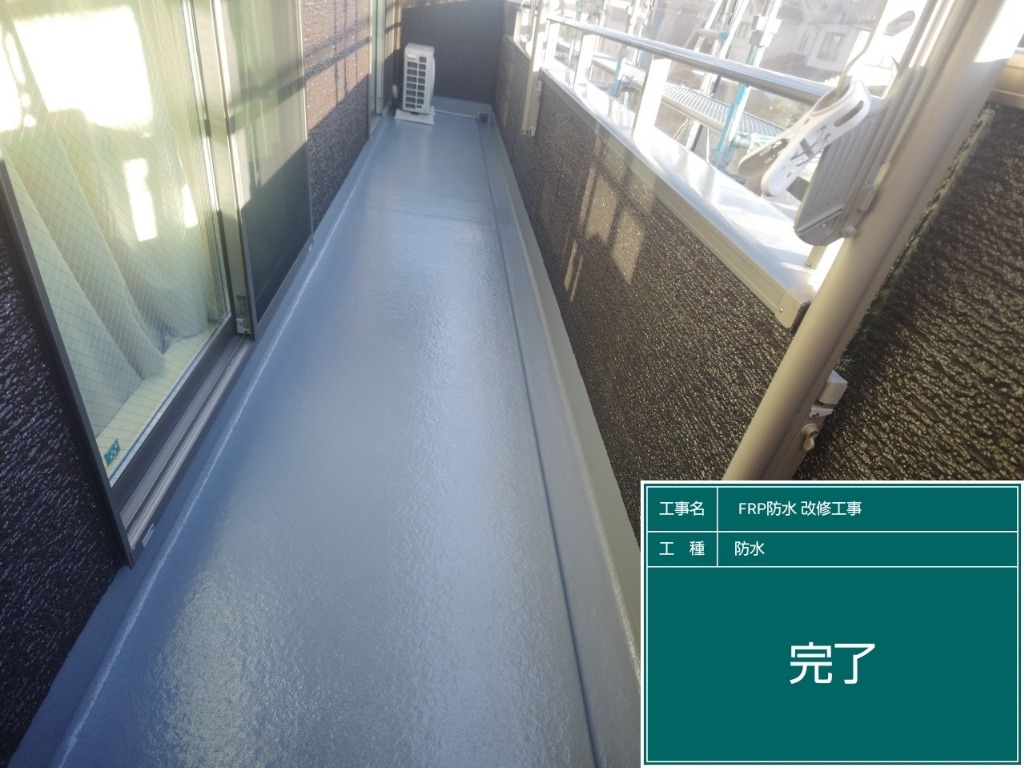 本日はベランダFRP防水工事が完了いたしましたので、お写真を載せさせて頂きます。